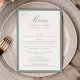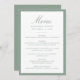 This wedding menu features “Menu” in soft sage green calligraphy, complemented by clean serif typography for the couple’s names, date, and reception courses. The muted green border brings a calm, natural touch while maintaining a structured and timeless look. Ideal for garden, vineyard, and outdoor weddings, this menu blends freshness with classic design.