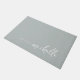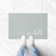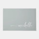 Feminine Elegant Minimalist Sage Green Modern Monogram Name Script Signature Custom Personalised Doormat. Featuring first name in a pretty hand lettering swash tail font calligraphy (or typography) on sage green or dusty green colour background. Great stylish feminine housewarming gift, also for birthday, anniversary, bridal shower, wedding, bachelorette party and It’s for the girl who likes clean minimalist things.