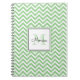 Personalised spiral notebook features a trendy sage green chevron pattern with custom name in black handwriting font and monogram in matching sage green in white square frame.
