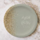 The left-hand edge of these elegant modern wedding paper plates features a gold faux glitter design. Personalise them with the names of the bride and groom in ivory handwriting script over a large ampersand on a sage green background, with the wedding date below.