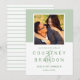 Modern wedding save the date announcement cards feature a square engagement photo framed in aloe / sage green with a simple and minimalist style monogram of the bride and groom names with an elegant script ampersand. Personalise the save the date wording with the wedding date and location. The back of the card includes a sleek pattern of thin leafy foliage green and white horizontal stripes.