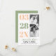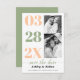 Modern sage green and peach two photo Save the Date announcement. It showcases the date in peach and sage green typography in a column and two photos of the couple. The phrase "Save the Date" is in script style typography. The back is of solid sage green colour.
