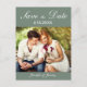 Send a personalised modern wedding save the date announcement photo postcard to your family and friends to announce your wedding engagement. This minimalist design template features white calligraphy on a sage green background with your custom photo. The back of the postcard has more of your wedding details for you to customise over your faded photo. Congrats on your engagement! Designed by artist Susan Coffey.
