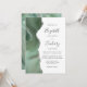 The left-hand edge of this elegant modern wedding invitation features a sage green watercolor agate border trimmed with faux silver glitter. The customisable text combines handwriting, copperplate and italic fonts in charcoal grey on a white background. The reverse side features a matching sage green and silver agate design.