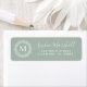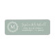 Stylish monogram return address labels with easy to personalise templates - A white wreath silhouette surrounding a simple monogram on a sage green background. The template for your name is in a chic calligraphy script and the address is written in a simple font. Personalised return address labels with a feminine wreath and monogram adds a clean and personal touch to your mail. To change the background colour, font styles and sizes click the personalise button.