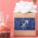 A silver chrome like Sagittarius zodiac symbol on a vibrant navy blue digital camouflage design texture print background. A modern urban racy design for a great custom birthday gift idea.