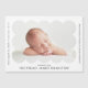 Simple and modern birth announcement magnet featuring your baby's photo nestled inside of a white scalloped frame. Personalise the birth announcement magnet by adding your baby's name and additional information in black lettering.
