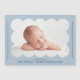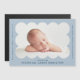 Simple and modern birth announcement magnet featuring your baby's photo nestled inside of a light blue scalloped frame. Personalise the birth announcement magnet by adding your baby's name and additional information in navy lettering.