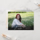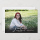 This modern graduation party invitation features a horizontal photo that fills the entire front of the card and a second faded photo on the back. Modern handwriting script appears over the photo that reads '25 graduate. Custom text allows you to add the graduate's name and school on the front and party invitation on the back.