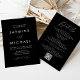 Simple and elegant all-in-one wedding invitations featuring a white, handwritten script mixed with modern lettering against a black background. Personalise the front of the minimalist wedding invitation with your name and wedding details. Personalise the back of the invitation with wedding details such as reception information, hotel accommodations, RSVP instructions, and wedding website. Add your desired wedding website link to the provided QR Code template so your guests can easily RSVP online and view additional wedding information. The black and white all-in-one wedding invitations are the perfect choice for modern weddings.