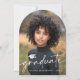 Arch shaped photo announcement card featuring your photo, a graduation cap and the text "graduate" in a modern, elegant script font. Add an additional photo and a custom message on the back.