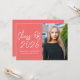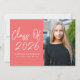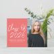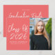 Modern graduation party invites featuring "Class of 2025" in a white handwritten script on a coral background. Personalise the front of the graduation invite by adding the graduate's name, school name, and vertical photo. The invite reverses to display your graduation party details in white lettering on a coral background.