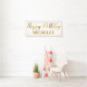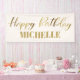 Cream/white and gold "Happy birthday" party banner customised with the name of the guest of honour.
