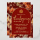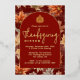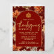 An invitation to Thanksgiving dinner featuring elegant fall leaves and gold foil accents. "Thanksgiving Dinner" is written in a contemporary handwritten font, with all event details prominently displayed in the centre against an arch design. The background is adorned with fall colours and leaves, giving it a festive feel. The back of the invitation showcases a complementary autumn leaves pattern.