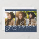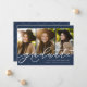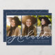 Celebrate your graduate three-photo graduation announcement that features a modern and trendy calligraphy script "graduate" on the front in white against a classic navy blue background. The back of the card features a simple geometric pattern in navy and white. The colour can be changed by clicking "customise further."