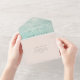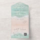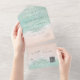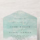 Romantic coastal themed wedding all in one invitation features beautiful turquoise abstract watercolor sparkling ocean wave and hearts in the sand beach background, toped with stylish script and elegant serif font, modern and simple, great for nautical beach wedding, tropical destination wedding, coastal ocean themed wedding in summer.