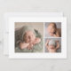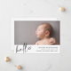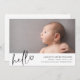 Birth announcement with modern script hello with a cute heart instead of the letter "o". One photo on the front and 3 on the back.