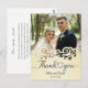 This picture is a wedding thank you card featuring a photograph of a couple, with decorative elements and text.