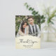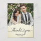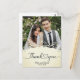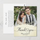 This picture is a wedding thank you card featuring a photograph of a couple, with decorative elements and text.