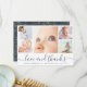 A minimalist modern style square photo grid collage thank you card is perfect for thanking your baby shower guests for gifts, love, and support received, and to introduce your newborn to the world! The modern design features a collage of 5 square customisable photos. Below there is a ´´love and thanks´´ message in elegant script and your baby's name and stats, in simple lettering. The back of the card has a lovely, delicate faux gold and navy blue botanical motif. Through the "personalisation" button, you can replace the photos and change the text.