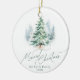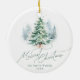 Personalized Christmas ornament features watercolor pine tree and elegant merriest Christmas script in sage green, modern and simple. Custom your own family name.