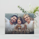 Modern minimalist merry Christmas card design features family name in elegant trendy script and typography, with personalised family photo, simple and unique greeting cards.