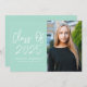 Modern graduation party invites featuring "Class of 2023" in a white handwritten script on a mint green background. Personalize the front of the graduation invite by adding the graduate's name, school name, and vertical photo. The invite reverses to display your graduation party details in white lettering on a mint green background.