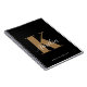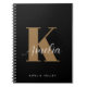 Modern black notebook featuring your monogram initial in a bold and large gold font and your name in a stylish white calligraphy signature script.