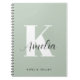 Modern sage green notebook featuring your monogram initial in bold and large white typography and your name in a stylish calligraphy signature script.