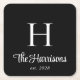 Modern monogrammed black coaster with your name in a stylish white script. Add an initial and the year established in elegant white typography.
