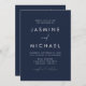 Simple and elegant all-in-one wedding invitations featuring a white, handwritten script mixed with modern lettering against a navy background. Personalise the front of the minimalist wedding invitation with your name and wedding details. Personalise the back of the invitation with wedding details such as reception information, hotel accommodations, RSVP instructions, and wedding website. Add your desired wedding website link to the provided QR Code template so your guests can easily RSVP online and view additional wedding information. The navy all-in-one wedding invitations are the perfect choice for modern weddings.