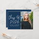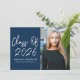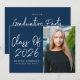 Modern graduation party invites featuring "Class of 2025" in a white handwritten script on a navy background. Personalise the front of the graduation invite by adding the graduate's name, school name, and vertical photo. The invite reverses to display your graduation party details in white lettering on a navy background.