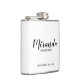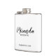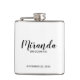 This flask features personalised bridesmaid's name in black modern script font style with title and wedding date in black modern sans serif font style on white background.