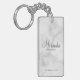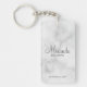 This keychain features personalised bridesmaid's name in grey modern script font style with title and wedding date in grey modern sans serif font style on white marble background.