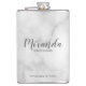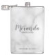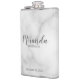 This flask features personalised bridesmaid's name in grey modern script font style with title and wedding date in grey modern sans serif font style on white marble background.