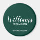 featuring personalised groomsman's name in white modern script font style with title and wedding date in modern sans serif font style on emerald green background.