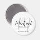 This magnet features personalised groomsmen's name in grey modern script font style and monogram in light grey modern script font style as background with title and wedding date in grey modern sans serif font style on white background.