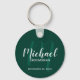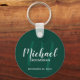 This keychain features personalised groomsmen's name in white modern script font style and monogram in light emerald green modern script font style as background with title and wedding date in white modern sans serif font style on emerald green background.