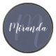 featuring personalised name in white modern script font style and monogram in light navy blue modern script font style as background