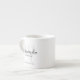 This mug features personalized bridesmaid's name in grey modern script font style and monogram in light grey modern script font style as background with title and wedding date in grey modern sans serif font style.