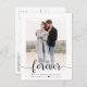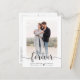 Simple and elegant, this photo engagement announcement postcard is the perfect way to let your family and frineds know the good news before you have a wedding date set. The card features a photo on a clean white background with the names of the couple and the date and place they got engaged, and a trendy script font announcing the “beginning of forever.”  The back is blank for versatility.