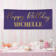 Elegant purple and gold "Happy birthday" party banner customised with the name of the guest of honour. The background colour on this banner is completely customisable, so design on with your party colours today.