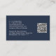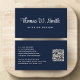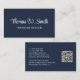 Modern professional dark blue business card with your name monogrammed in a bold stylish white script and your title and contact information (such as email, telephone numbers, firm name, mailing address and social media user id's) in clean, simple white typography. On the back, personalise with your contact information and add a url address to create a scannable QR Code connected to your website, portfolio, social media profile, or any other platform that showcases your work, making it easy for customers and clients to explore your expertise.