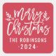 Stylish Merry Christmas holiday favour sticker features white script writing and accents of branches with holly leaves and berries. Personalise with custom name / family and year text. The crimson red background colour can be modified.