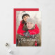 Personalise these modern Merry Christmas in script writing holiday photo greeting cards with two photos (front and back of card) and custom text. The red background image on the back can be removed and changed to a different printed background colour.