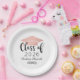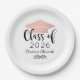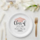 Custom paper graduation plates feature a modern and elegant personalised design with the graduate's name, their class year in trendy black calligraphy script, a rose gold / blush pink coloured grad cap motif, and scroll accent.