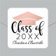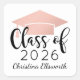 Custom graduation stickers feature a modern and elegant personalised design with the graduate's name, their class year in trendy black calligraphy script, and a rose gold / blush pink coloured grad cap motif. Use to accent announcement card envelopes or graduation party favours!