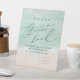 Beautiful turquoise abstract watercolor sparkling ocean wave and hearts in the sand beach background, toped with stylish script and elegant serif font, modern and simple. Great wedding photo guest book sign for nautical beach bridal shower, tropical destination wedding, coastal ocean themed party.