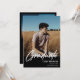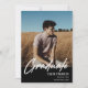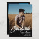 Modern white script "Graduate" overlay, senior class photo graduation announcement and invitation in black. Template lines for graduate's name, class of year and school. Back of card features 2 additional photo spaces with text lines for your open house/graduation party details.