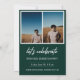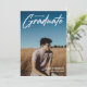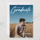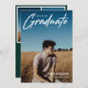 Modern white script "Graduate" overlay, senior class photo graduation announcement and invitation. Template lines for graduate's name, class of year and school. Back of card features 2 additional photo spaces with text lines for your open house/graduation party details on green colour background.